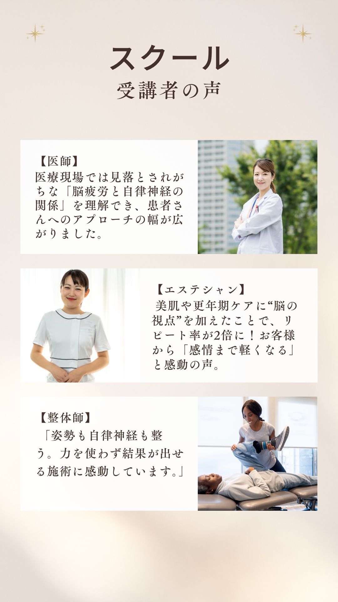 最新の脳科学・生理学・栄養学をベースに、頭蓋脳セラピー・睡眠脳セラピーなど実技を組み合わせた唯一無二の教育体系。