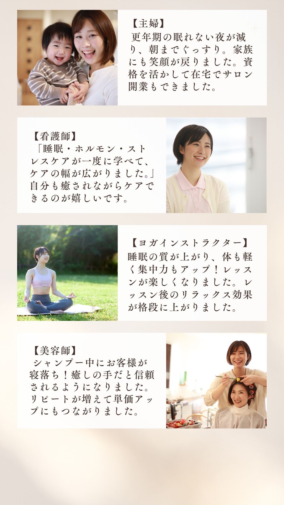 認定セラピストとしてディプロマを所得。施術提供・自宅サロン開業・講師活動など、幅広く活躍できます。