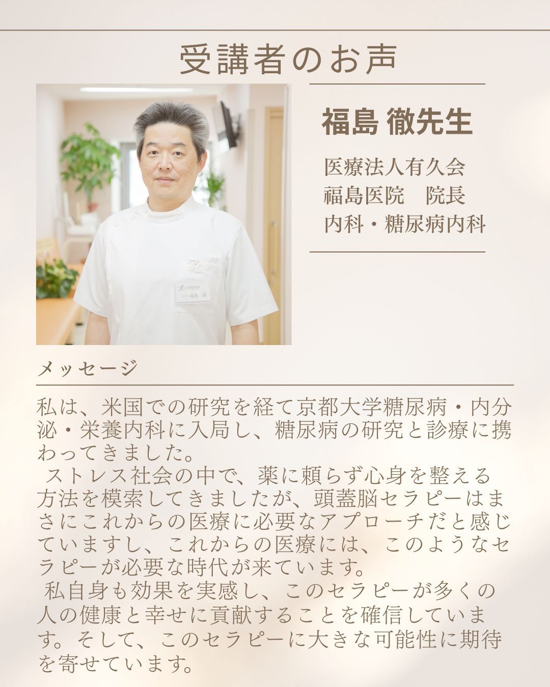 日本頭蓋脳セラピー協会 代表 高橋 勉 近年、「なんとなくしんどい」「眠れない」「集中できない」「子どもの脳の疲れが気になる」 そんな声を、本当にたくさん耳にするようになりました。 私は脳が全ての根源だということに着目し、日本人の体質・生活習慣・ストレス特性に合わせた“脳のためのセラピー”を開発しました。 そこから延べ数十人以上の施術を通じて、また臨床実験を行い、科学的データを所得した時、必ず世の中の為になる!と確信しました。 人の不調の多くは、“脳の疲労” が原因である。 そして、脳は整えば必ず回復し、人生そのものが変わる。 脳が整えば、心が軽くなり、体が動き、睡眠が深まり、人生のパフォーマンスが上がります。 そしてそれは、何歳からでも遅くありません。 私たち協会は 「日本の脳を健康にする」 という大きな志を掲げ、全国へセラピスト・講師を育成し、一人でも多くの方が“本来の脳の力”を取り戻す社会をつくっていきます。あなたやあなたの大切な人の未来が、“脳から変わる”ことを心から願っています。